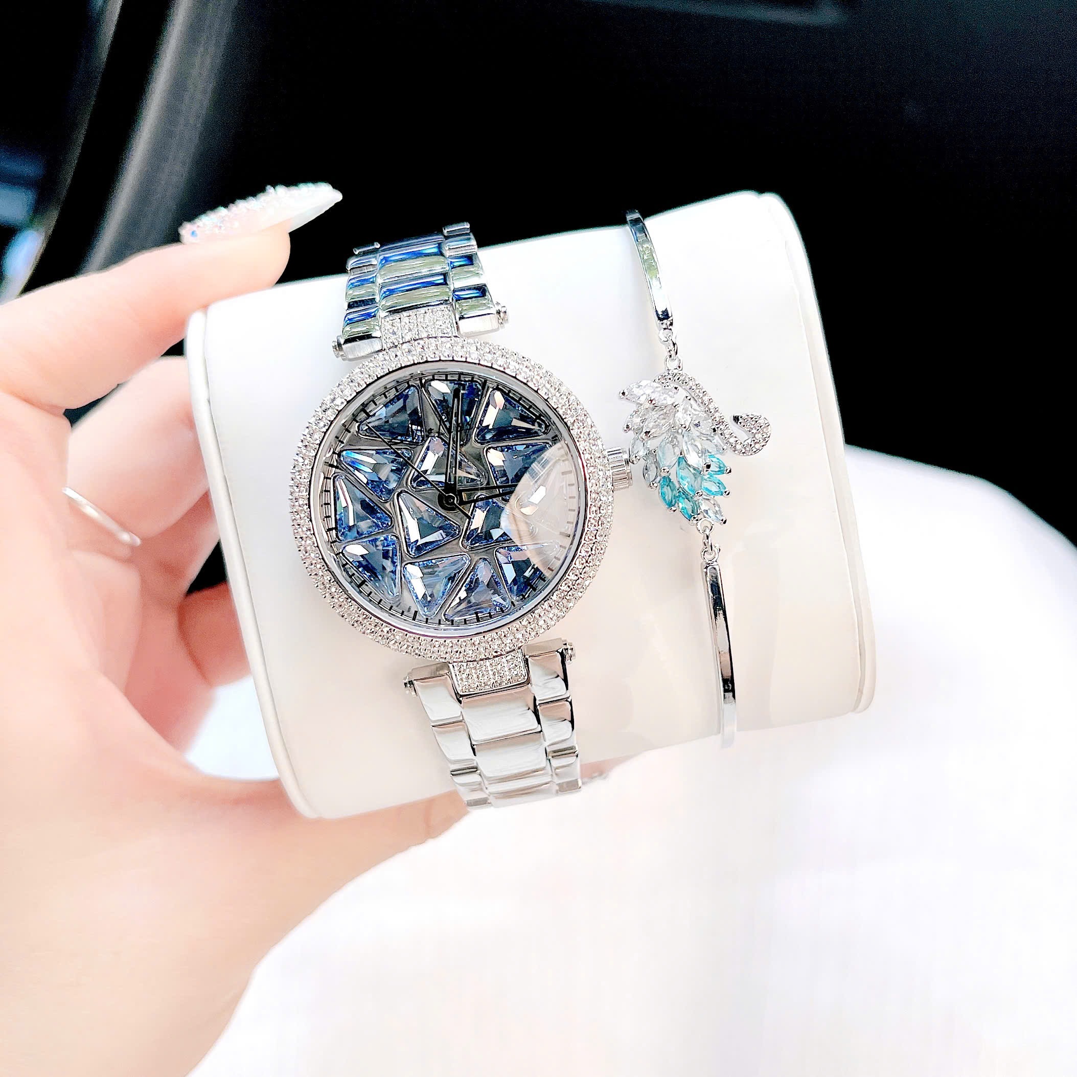 Kiểu dáng: Mặt tròn (Đính pha lê xanh)